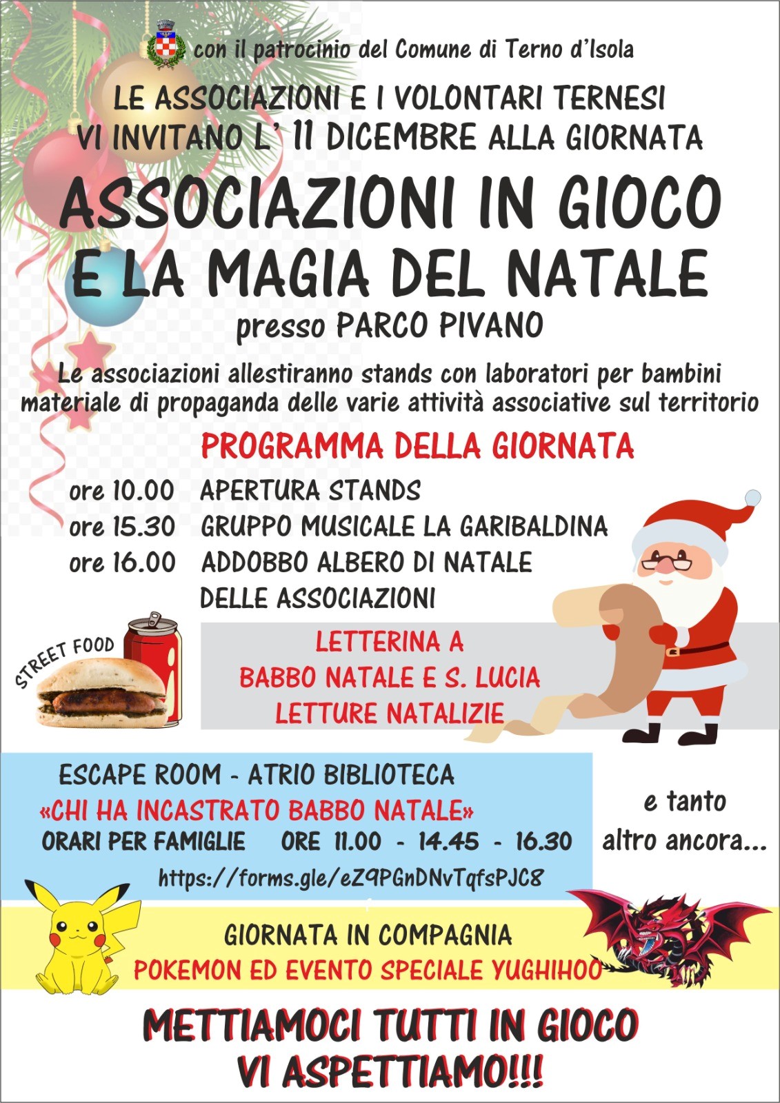 Le associazioni e i volontari ternesi vi invitano Domenica 11 Dicembre 2022 C/O il parco Pivano a partire dalle ore 10:00 alla festa di Natale.