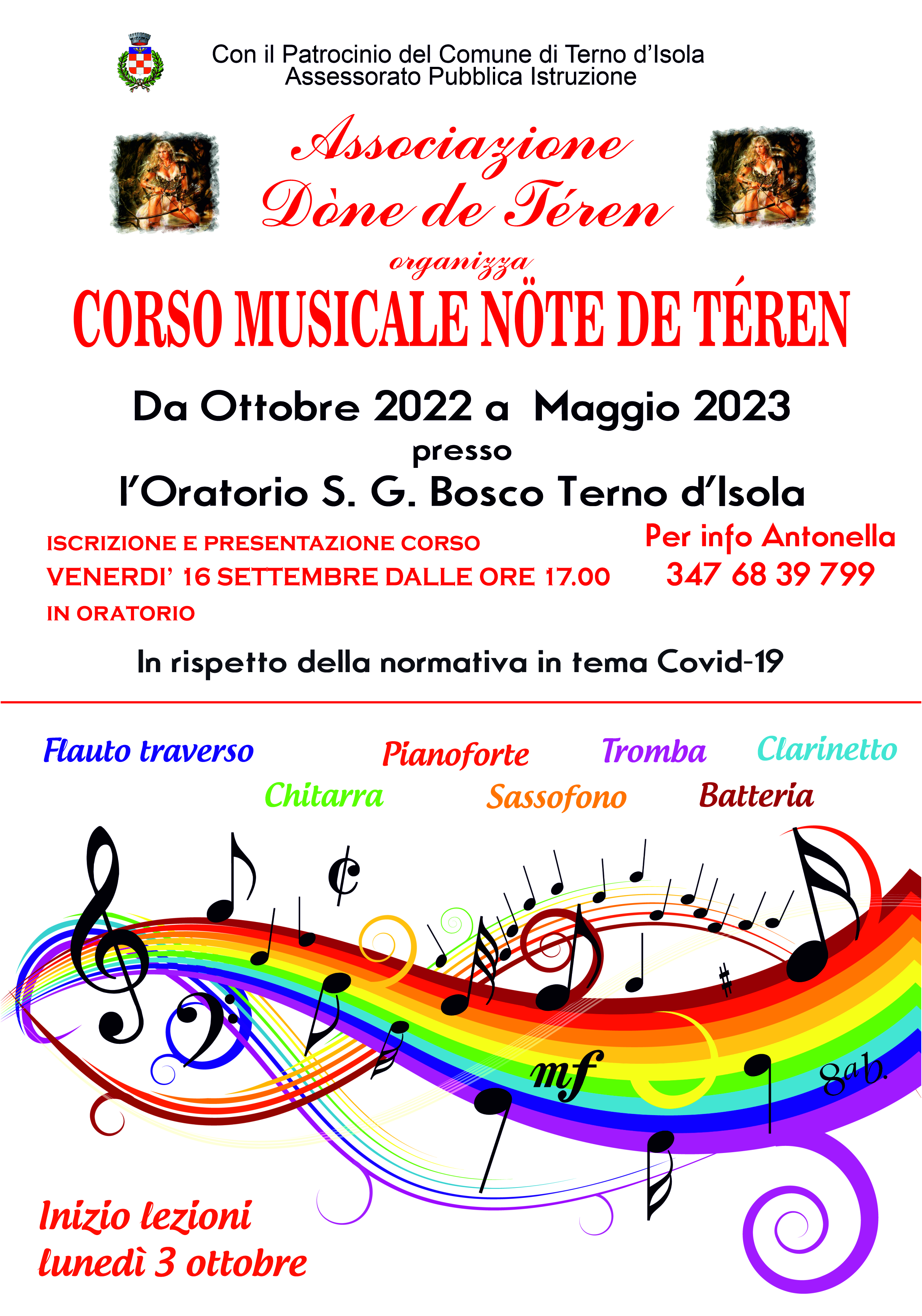 L'associazione Done de teren organizza anche per l'anno 2022/2023 il corso musicale "Note de teren" C/O l'oratorio S.G. Bosco di Terno d'isola a partire da Lunedì 03 ottobre.